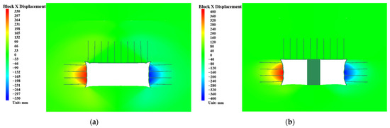 Horizontal displacement distribution contour under different support forms: (a) conventional bolt-cable support; (b) area control support.