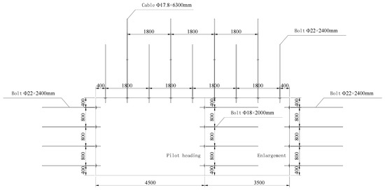 Ribs: Φ22 mm × 2400 mm high-strength longitudinal-ribless rebar bolts, spacing 800 mm × 800 mm; Φ18 mm × 2000 mm fiberglass bolts on the enlargement side rib of the pilot heading, spacing 800 mm × 800 mm.