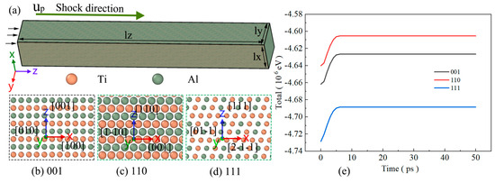 (a) Schematic diagram of the impact. Three crystal directions, [001], [110], and [111], are set on the Z-axis, and (b–d) are the crystal direction interfaces, [001], [110], and [111], respectively. (e) The state of the total energy after equilibrium relaxation.
