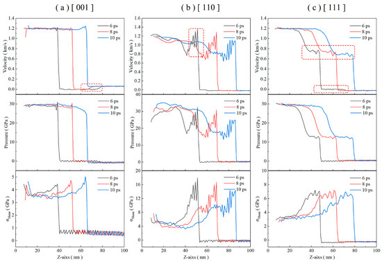 To deeply reveal the impact response mechanism of TiAl alloys under different crystal orientations, Figure 2 shows the evolution curves of particle velocity, pressure, and shear stress along the three crystal directions of [001], [110], and [111] at multiple time steps (6 ps, 8 ps, and 10 ps).