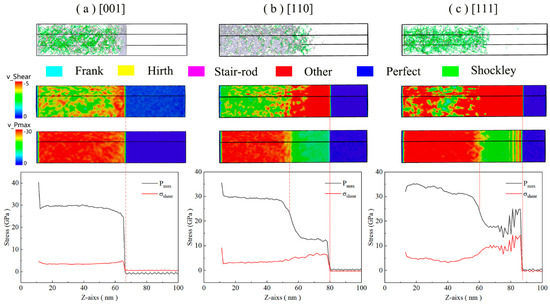 From the three-dimensional distribution characteristics of shear stress, sufficient shear stress was generated during the impact process to drive the occurrence of plastic flow. In the unimpacted area, the shear stress is approximately zero. When the shock wave front enters the interior of the material, the shear stress rises rapidly and reaches a relatively stable value in the elastic zone. However, when observed from right to left along the direction of impact propagation, the shear stress shows a significant attenuation trend from the elastic region to the plastic region, especially in the [110] direction. This attenuation phenomenon is mainly attributed to the local stress relaxation caused by the nucleation and slip process of dense dislocations. In contrast, the dislocation density under loading [110] is concentrated and has a smaller distribution range, resulting in the rapid release of shear stress over a short distance. In the [001] orientation, since dislocations are uniformly generated in the larger plastic regions, the process of shear stress release is relatively gentle, forming an approximate plateau shape, and the overall shear stress level is lower than that of the [110] and [111] orientations. Furthermore, in the front part of the shock wave, the shear stress platform of the [001] orientation is relatively narrow, while the remaining crystal orientations show a wider shock absorption transition zone. These observations indicate that shock wave structures (such as frontier width and wave velocity) and plastic responses are significantly sensitive to crystal orientation.