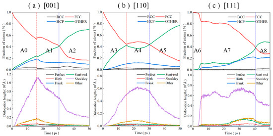 Under extreme loading conditions such as impact compression, the interior of the alloy often undergoes intense non-equilibrium microscopic reconstruction processes, manifested as complex evolution behaviors with multi-scale and multi-mechanism coupling. Studies have shown that structural phase transition and dislocation dynamics are the key microscopic mechanisms regulating the macroscopic mechanical responses of materials [48,49,50]. Compared with static loading or quasi-static loading, the transient high-pressure and high-temperature environment induced by impact can significantly reduce the phase transition potential barrier and drive the lattice structure to undergo non-equilibrium reconstruction paths from face-centered cubic (FCC) to closely arranged hexagonal (HCP) and even amorphous states. Furthermore, the impact plasticity process at high strain rates is also accompanied by complex dislocation activities, including the excitation, slip, and annihilation of the Shockley partial dislocations. This type of dislocation behavior not only directly affects the local stress–strain distribution but also may trigger the dynamic regulation of stacking fault energy (SFE), thereby reshaping the structural evolution path and critical conditions. Figure 4 systematically compares the time evolution of substructure types (upper figure) and the changes in total dislocation length (lower figure) of three typical crystal orientations—[001], [110], and [111]—during the impact loading process, revealing significant crystal orientation correlations.