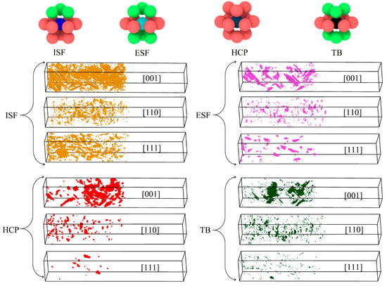 Figure 5 shows the schematic diagrams of the local atomic configurations of typical defects such as ISF, ESF, HCP, and TB, as well as their spatial distribution patterns in different crystal directions. Under the loading condition for the [001] direction, ISF shows a wide range of expansion, and the local lamella tilt and unfold along the {111} group slip plane, indicating that the FCC → HCP phase transition is mainly achieved through the layered rearrangement process induced by ISF. The corresponding HCP atomic configurations are concentrated in the ISF-rich region, verifying the dominant role of Shockley dislocation slipping-induced stack recombination in HCP lamellar nucleation. In contrast, the number of ESF and TB is limited and their distribution is scattered, indicating that the phase–phase-dominated local reconstruction in this direction is superior to the twin mechanism, which limits the expansion and penetration of TB.