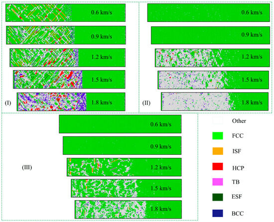 Microstructure evolution characteristics under different crystal orientations at various impact velocities: (I) [001], (II) [110], and (III) [111].