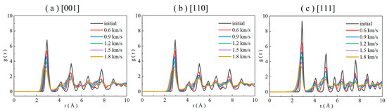 Radial distribution function g(r) diagrams of the three crystal directions, [001], [110], and [111], at different speeds.