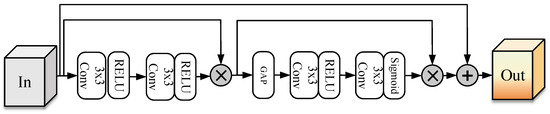 This unified architecture effectively combines local feature extraction (, ) with global context modeling (GAP) through a bottleneck design (, ) that provides dimensionality reduction, while maintaining expressiveness. By organically integrating dual attention mechanisms in the spatial and channel dimensions, this feature enhancement module significantly improves the model’s adaptive calibration capability for multi-band features and substantially boosts the representational performance, while theoretically minimizing information loss through principled optimization.