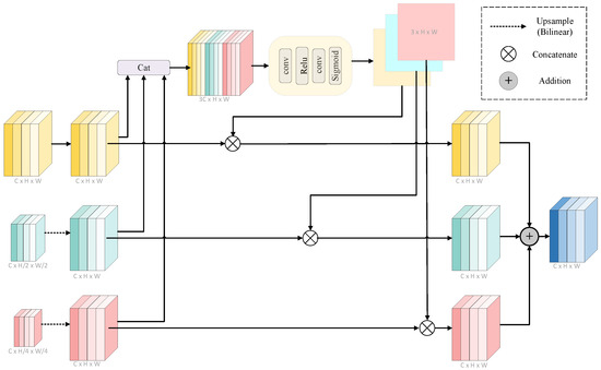 Specifically, the DAM module takes the enhanced multi-scale feature set from the FEM modules as input, where features exist at different spatial resolutions corresponding to the pyramid levels. The weight learning branch first upsamples all features to ensure spatial consistency, then concatenates them to form a comprehensive multi-scale representation. This concatenated feature undergoes channel compression and nonlinear transformation through two layers of convolutions with ReLU activation, followed by a Softmax operation to generate pixel-level adaptive weights , where each represents the adaptive weight map for the corresponding feature level.