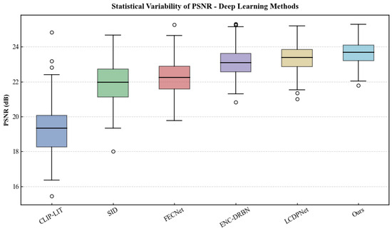 To address the critical concern of result variability and provide the statistical analysis required for a rigorous evaluation, we conducted a comprehensive assessment of the PSNR variance across different methods. Figure 4 presents the statistical distribution of PSNR values for representative methods on the LCDP dataset, revealing important insights into method stability and reliability.