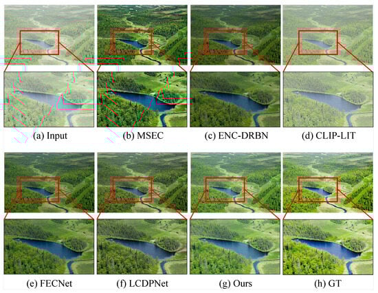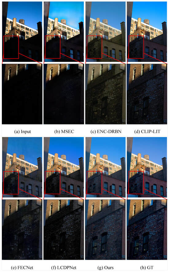 Figure 6 displays the comparative experimental results on the LCDP dataset. For the severe dark areas present in the input images (particularly on house walls and windows), most existing methods struggled, leading to a substantial loss of detail information in these regions. Texture details in the building facade show enhanced window structure definition, with preserved architectural details, while sky regions exhibit a more natural brightness gradation, with reduced halo artifacts. The analysis reveals that existing methods generally suffered from inadequate exposure control, manifesting as localized overexposure or underexposure issues. Additionally, LCDPNet exhibited noticeable color distortion. In contrast, our method quantifiably enhanced the dynamic range performance, while preserving natural colors, achieving not only a more balanced global brightness distribution, but also an improved texture detail representation, resulting in markedly enhanced image clarity.