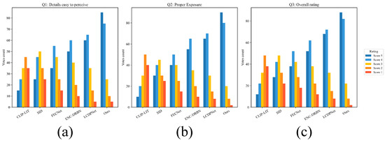 The experimental design employed a comparative assessment framework, where evaluators examined image pairs processed by different deep learning methods. Participants were asked to evaluate three distinct aspects of image quality: details easy to perceive, which measured the clarity and preservation of fine textures and structural elements; proper exposure, which assessed the naturalness and balance of exposure correction, without artifacts; and overall rating, which captured the comprehensive aesthetic quality and realism of the processed images. Each aspect was rated using a 5-point Likert scale, ranging from poor to excellent. To ensure unbiased evaluation, images were presented in randomized order, without method identification, and participants were given sufficient time for careful examination of each image pair.