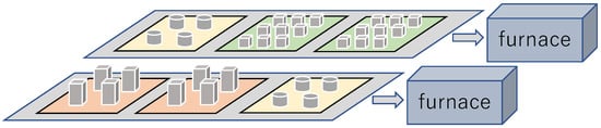 This study focuses on a scheduling problem arising in the heat treatment process of metal parts (Figure 1) at the Tsukimi Factory of Nagato Co., Ltd., located in Hiroshima, Japan. While this problem shares similarities with the Job-Shop Scheduling Problem (JSSP), it is distinct in terms of the interdependencies between batch processing and the temporal structure of available slots. In this setting, multiple furnaces operate in parallel, each processing a sequence of orders, where each order consists of a single type of metal part. These parts are heated to high temperatures—approximately 1000 °C in our case—and then cooled using fans. Each metal part is characterized by the following three attributes: