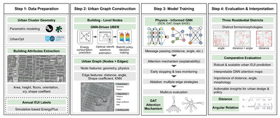 Despite these promising developments, several key limitations persist. Most existing GNN-based UBEM studies treat inter-building relationships as purely topological or geometric, without explicitly encoding physically meaningful interactions such as shading effects, solar orientation, or radiative exchanges. However, recent physics-based UBEM research has demonstrated that accurate modeling of shading effects can significantly impact energy prediction accuracy [14]. Nevertheless, precise modeling of inter-building shading and radiative exchanges at the urban scale remains challenging, often requiring simplification strategies to ensure computational tractability even in physics-based approaches [15]. This further underscores the need for GNN-based UBEM models to incorporate physically meaningful interactions computationally efficiently. Furthermore, while attention-based GNNs provide mechanisms for explainability, few UBEM studies have systematically evaluated whether learned attention patterns align with known physical principles, limiting such models’ transparency and practical trustworthiness. Another critical gap concerns the generalization capability of GNN-based UBEM models. Many prior works focus on single-district or homogeneous datasets, raising questions about the scalability and transferability of these approaches across cities with heterogeneous urban morphologies, construction typologies, and climatic contexts [16]. Recent reviews of UBEM and urban climate modeling integration also highlight the challenges of dataset heterogeneity and limited cross-district generalization [17].