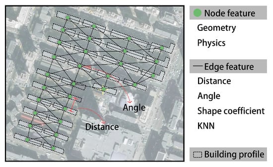 where was empirically set to 30 m, consistent with standard urban morphological practices and prior UBEM–GNN studies [57,61]. This threshold was selected to capture immediate spatial interactions relevant to energy exchange and mutual shading effects, while maintaining a manageable graph sparsity level.