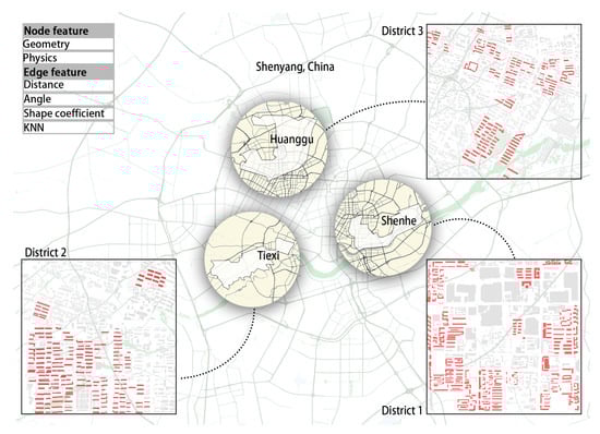 The proposed framework was applied to three representative old residential neighborhoods in Shenyang, China: Shenhe District, Huanggu District, and Tiexi District (Figure 4). All three clusters consist primarily of mid-rise residential buildings constructed during the 1980s–1990s, featuring similar building typologies, construction eras, and urban forms. This homogeneous selection allows for a focused evaluation of the generalization ability of the physics-informed GNN model within old residential settings, minimizing confounding factors due to differences in building type or vintage.