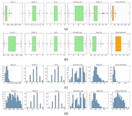 - Shape coefficient (S): Defined aswhere h is the assumed typical story height (e.g., h = 3 m); this parameter reflects the morphological compactness and thermal characteristics of each building.
