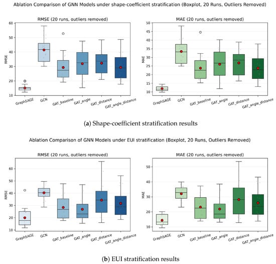 Classical feature importance techniques in machine learning have emerged as a prevalent approach for assessing variable contributions in tabular or vector-based machine learning models. Prominent examples of such techniques include the importance of SHAP and permutation features. However, applying these methods to GNNs, particularly those that employ relational edge-based features, is not without complexity. In the present context, edge attributes represent inter-building relationships that are not easily interpretable as independent input variables. GAT’s message passing mechanisms further complicate direct attribution using SHAP. Consequently, the process of ablation, defined as the systematic removal or modification of specific edge features, offers a more interpretable and targeted approach for evaluating each attribute’s physical relevance and contribution to the model’s performance in a relational setting. An ablation study was conducted to assess the contribution of the proposed physics-informed edge attributes to model performance. The survey systematically evaluated the model under different configurations of edge attributes in the GAT architecture.