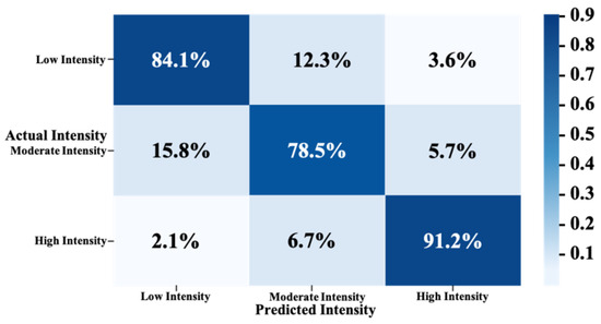 Confusion matrix of exercise intensity classification (LSTM-attention model), overall accuracy: 85.3%; Kappa coefficient: 0.86.