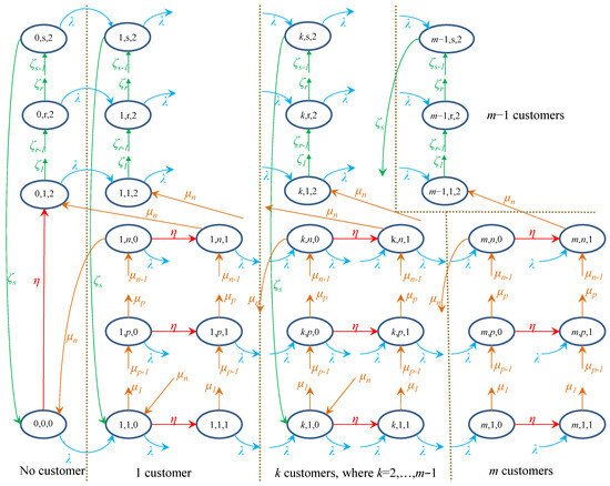 Based on these facts, we can represent the system as a triplet (k, p/r, f), which can describe each possible state of the system. Let us represent the mathematical model in a transition diagram—see Figure 1.