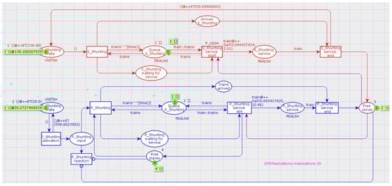 Figure 2 shows the simulation model with the initial marking. The model consists of 10 places, 9 transitions, arcs, and their inscriptions. In this simulation model, we applied a gamma distribution to generate the desired values of the random variables during simulation to validate the analytical model, which was modeled using a fixed approximation method, and we used the function ‘fun GaT (l,k) = gamma (l,k)’. In this function, l is the rate parameter and k is the shape parameter, as the Gamma distribution of probability is defined in CPN Tools by these two parameters. Please note that the Gamma distribution can be defined by the scale parameter instead of the rate parameter as well—it holds that the rate parameter is a reciprocal value of the scale parameter. Let us take into account that in this model, we used ‘P_Shunting’ and ‘S_Shunting’, which represented primary and secondary shunting, respectively. As we discussed earlier in this document, secondary shunting is considered a failure of the system.