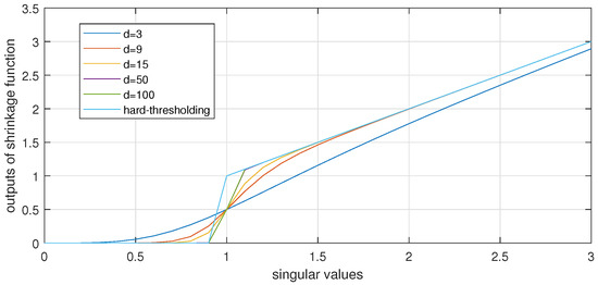 when d is sufficiently large. Contrarily, for large singular values, since , . Figure 1 shows this behavior for singular values uniformly distributed in ; as d increases, the curve approaches that of the Iterative Hard Thresholding (IHT) operator, which enforces sparsity to the results [32].