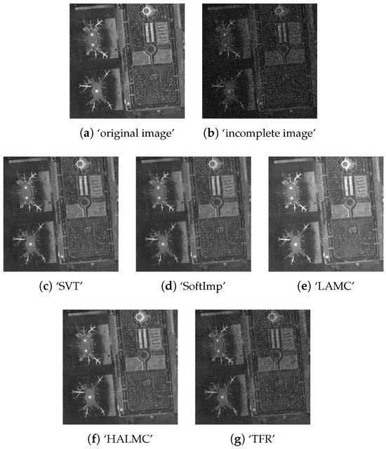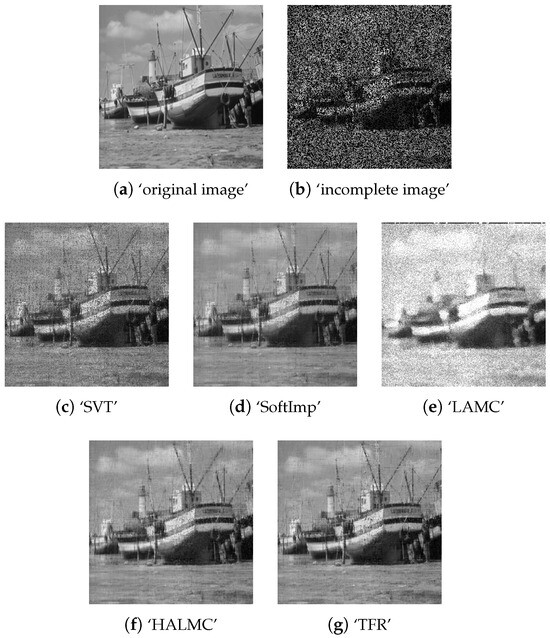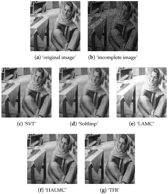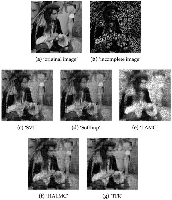 In terms of execution time, HALMC demonstrated significant efficiency while maintaining high accuracy. Although SoftImp achieved the fastest execution time, its performance degraded more rapidly as the incompletion ratio increased, specifically compared to HALMC. Overall, considering the execution time, robustness, and accuracy in image completion, HALMC emerges as the most effective algorithm among the four evaluated. Example output images generated by the algorithms for the case of 50% missing pixels are shown in Figure 3c–g, Figure 4c–g, Figure 5c–g and Figure 6c–g.