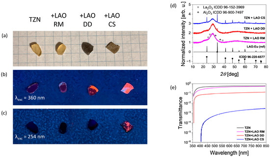 Photographs of the TZN and TZN + LAO samples in an ambient light (a), under 360 nm UV light (b) and under 254 nm UV light (c), (d) XRD results of the LAO:Eu crystals and TZN + LAO composites, (e) transmission spectra of the TZN and TZN + LAO composite samples.