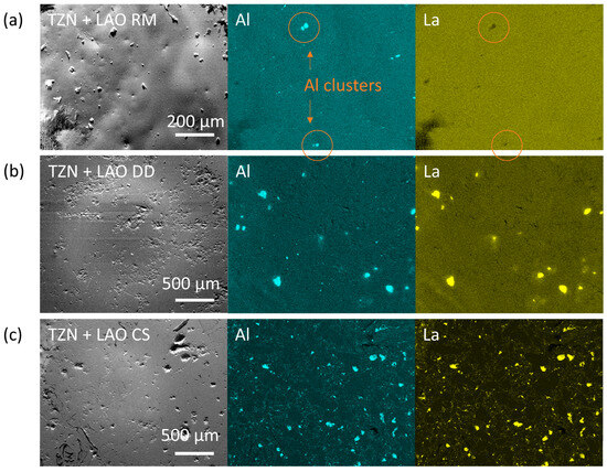 SEM images of the TZN + LAO RM (a), DD (b) and CS (c) samples (Left). Elemental mapping of Al (Middle) and La (Right) constituents of LAO in said samples.
