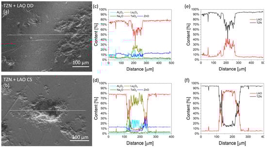 The cross-section of the crystalline areas in the DD and CS (Figure 3) provides additional details about the glass-crystalline interface in the samples obtained by two methods. The composition of the glass and crystals is the same in both samples (Figure 3c,d). The difference in the glass/crystal ratio can be due to the fact that the analyzed crystal is under the surface in the DD sample and on the surface in the CS sample. Although the elemental mapping indicates different stages of LAO dissolution in the glass matrix for samples prepared by DD and CS, the cross-section analysis shows that the glass/crystal interface is similarly sharp for both methods—see around the 160–170 and 260–270 μm marks in Figure 3e—contrasting with the sharp glass/crystal boarded in the CS sample—see the 105 and 250 μm marks in Figure 3f. The interdiffusion zone for both these samples was estimated to be around 30 nm (see Figure S4). This result may suggest that the thickness of the interdiffusion zone does not depend on the method, but rather is the result of the types of crystal and glass used for the composite preparation.