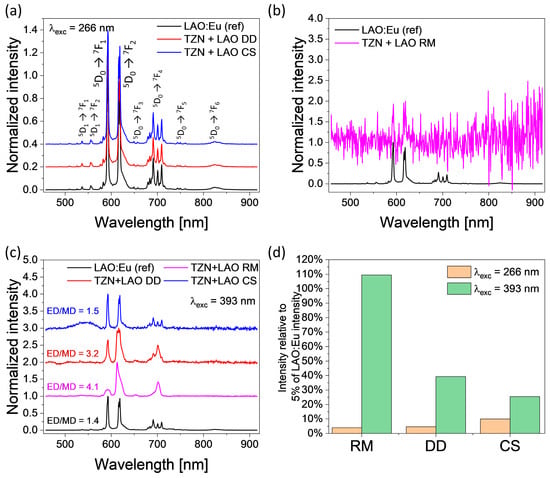 (a) Normalized emission spectra of TZN + LAO DD/CS composites and (b) emission spectrum of the TZN + LAO RM composite compared to the LAO:Eu emission spectrum as a reference excited at 266 nm. (c) Emission spectra of the TZN + LAO RM composite normalized to the maximum intensity compared to the normalized LAO:Eu emission spectrum as a reference excited at 393 nm and electric dipole- (ED) to magnetic dipole-type (MD) transition ratios for each spectrum. (d) Integral emission intensity expressed in percentage of the equivalent amount of LAO:Eu.