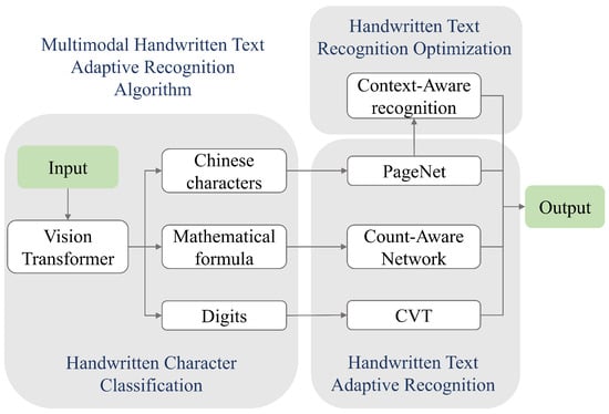 - A Multimodal Handwritten Text Adaptive Recognition algorithm, MHTR, is proposed for examination scenarios. By integrating a Handwritten Character Classification Module with a Handwritten Text Adaptive Recognition Module, the method enables effective recognition of mixed handwritten content, including Chinese characters, digits, and mathematical expressions.