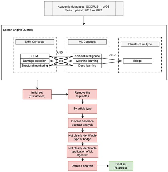 A set of key terms was first defined to initiate the search for academic articles, covering three main conceptual domains: structural health monitoring (e.g., “SHM”, “structural monitoring”, “damage detection”), algorithmic approaches (e.g., “artificial intelligence”, “machine learning”, “deep learning”), and the type of infrastructure under consideration (“bridge”). All possible combinations of these three concept groups were generated and connected using the AND operator (see Table 1 for the resulting queries). Each query was entered into the database search engines, targeting occurrences in the title, abstract, and keywords fields. This search process resulted in an initial pool of 512 articles, which were subsequently subjected to inclusion and exclusion criteria to identify the final subset of studies for analysis.