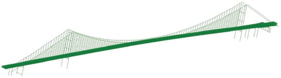 The model-driven methodology is another prevalent approach in which simulation models are used to analyze bridge behavior across various scenarios and conditions. These models are constructed using design parameters, material specifications, and environmental variables, enabling them to forecast bridge performance under a range of loading and environmental conditions. The use of ML within this framework enhances bridge construction, and maintenance precision and efficiency, while facilitating problem identification and decision-making. Figure 4 illustrates this approach, as shown in [], where an FEM was used to simulate the behavior of the China Tsing Ma suspension bridge.