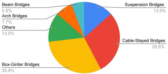 Furthermore, the literature review indicated a higher concentration of studies on specific bridge types, notably box-girder bridges, cable-stayed bridges, arch bridges, and suspension bridges, as illustrated in Figure 5. This section examines these predominant bridge categories and highlights the diverse techniques employed, alongside their corresponding achievements and outcomes.