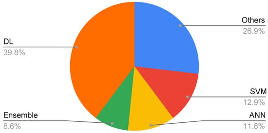 ANNs, support vector machines (SVMs), ensemble algorithms, and deep learning (DL) techniques are notable ML techniques employed in this domain. Figure 6 illustrates the distribution of these techniques, emphasizing the prevalent use of ANN and DL algorithms, which collectively constitute more than 50% of the total techniques reviewed in this study.