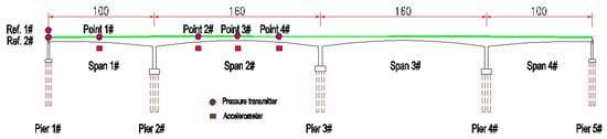 The data-driven approach is one of the most prevalent strategies for applying ML techniques in the realm of structural health monitoring systems. This approach relies on the analysis of substantial datasets to reveal patterns and correlations within the behavior of bridges. Sensors strategically placed on real bridges and external sources, such as geographical maps, weather records, and traffic data, can acquire data. Taking advantage of this wealth of data, ML algorithms can discern intricate patterns and trends that are invaluable in optimizing designs and enhancing bridge performance. Figure 3 shows an illustration of a sensor deployment similar to that employed by [], showcasing the use of uniaxial accelerometers to capture the bridge’s dynamic response.