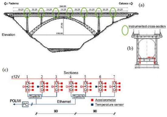 (a) general perspective of the real bridge, (b) scale model of TCRF bridge, (c) sensor placement on the scale model. Extracted from [].