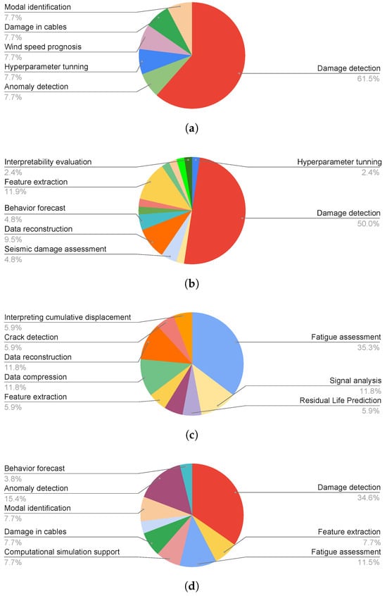 Currently, AI algorithms, particularly those based on ML, have established themselves as versatile tools that are applicable to various tasks. The structural health monitoring of bridges has seen increasing adoption of machine learning methods, including damage detection, localization, classification, and prediction, over the past few years. A key factor in the widespread use of these algorithms is their capability to adapt to different situations through the use of diverse data types, including vibration signals, images, and environmental factors. In this regard, analyzing the specific purpose for which these algorithms have been used in the SHM context is important. For example, early detection, prognosis, and reconstruction of missing data, as well as the type of information used for their training and validation, are crucial. This characterization enables the identification of trends, gaps, and opportunities in the design and application of AI-based bridge monitoring solutions.