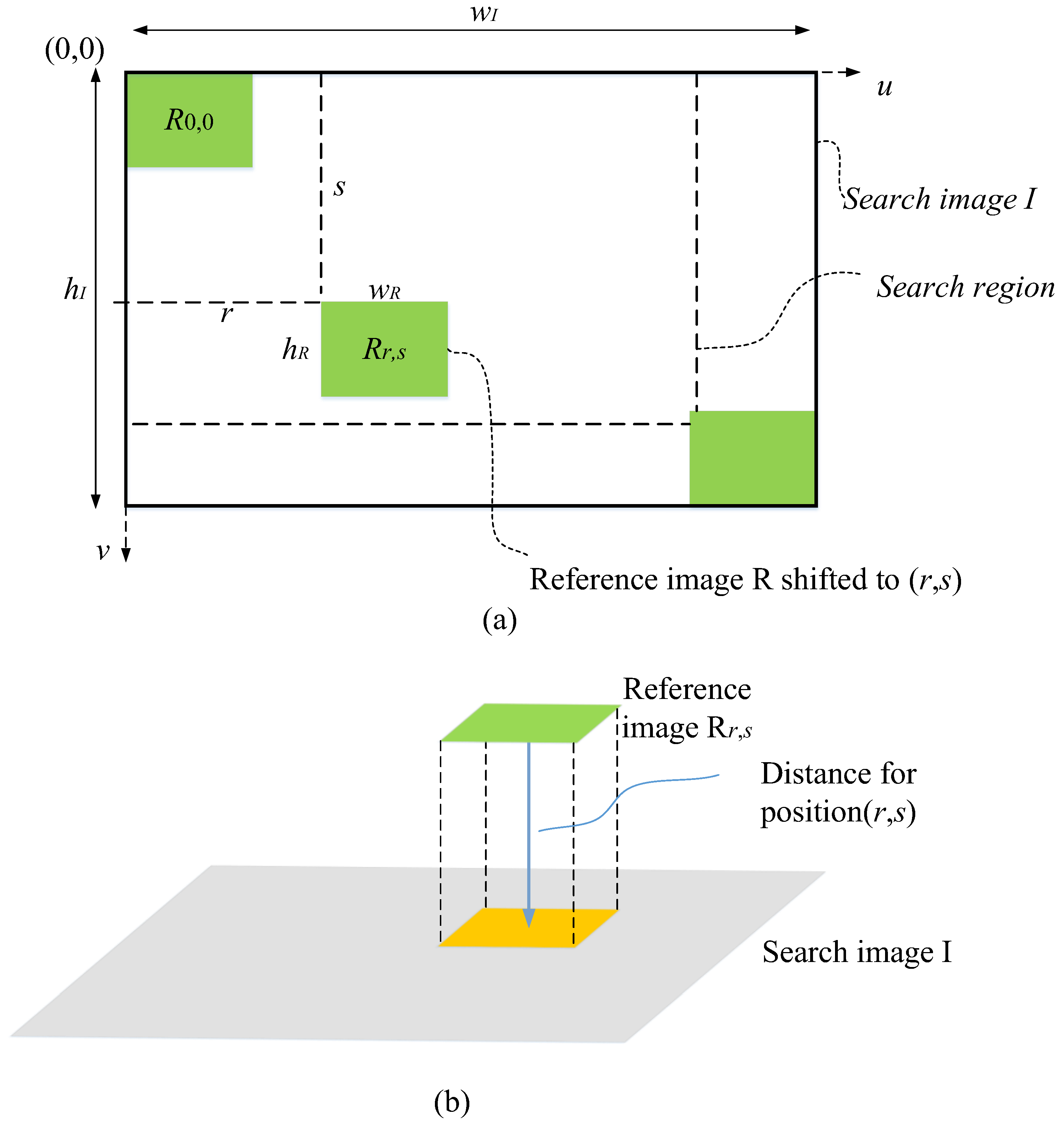 Template matching in gray-scale images mainly involves finding the same or most similar position between the template image R and the subimage in the searched image, I. The following equation represents the template offset in the image searched by (