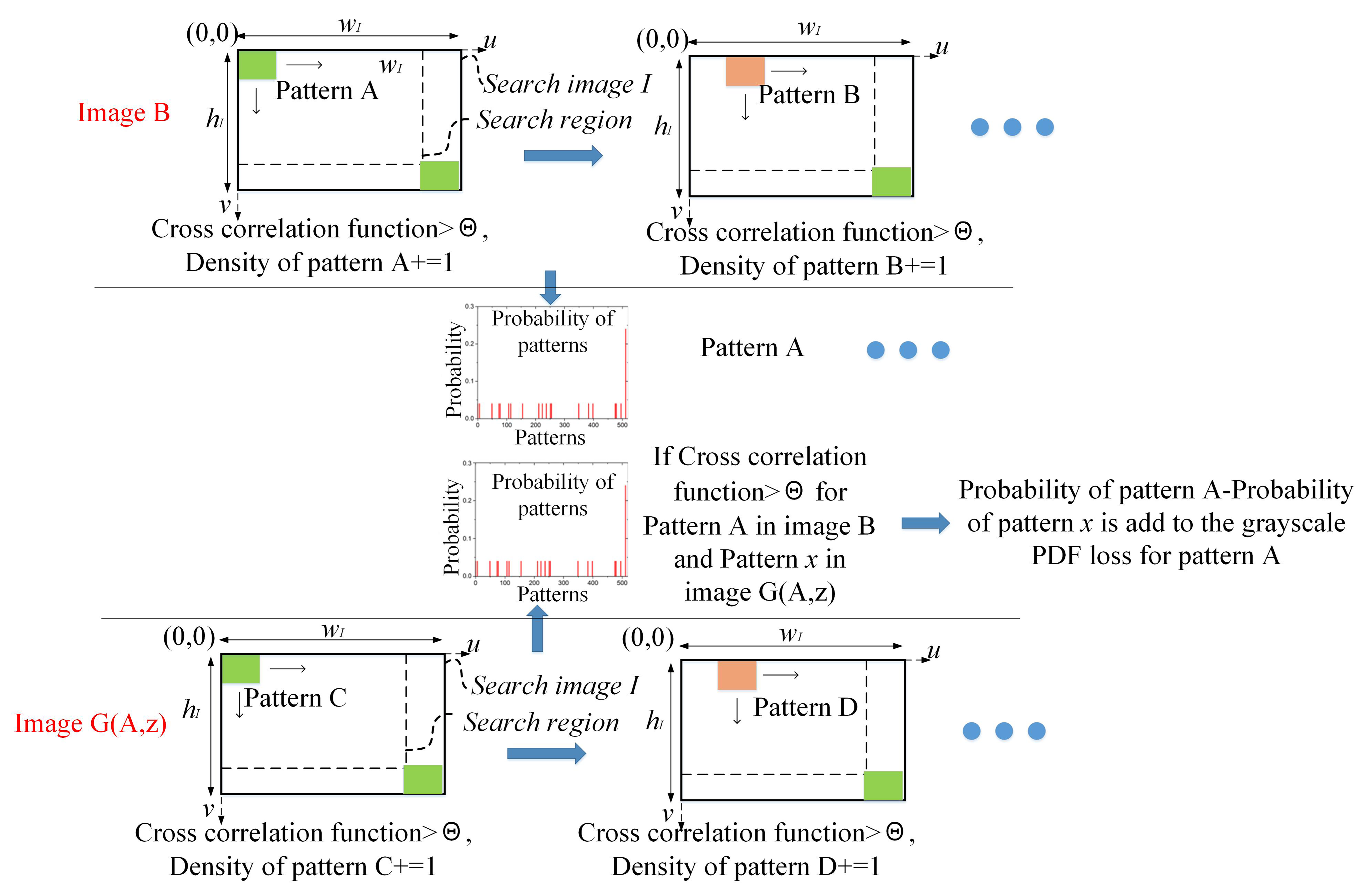 Section 2.2.2) encodes different patterns and compares their distribution across two binary core images. However, for a gray-scale core image template such as the 5 × 5 template, the value range of each pixel is 0–255 and the total number of patterns is large, which makes it impossible to encode and construct a pattern density function based on it. The MSE is used as a metric to measure the difference between two patterns. The cross-correlation function is a more suitable metric for gray scale patterns. Therefore, a new physics statistical descriptor—the gray-scale pattern density function—is constructed and proposed through a cross-correlation function. Its schematic diagram is shown in