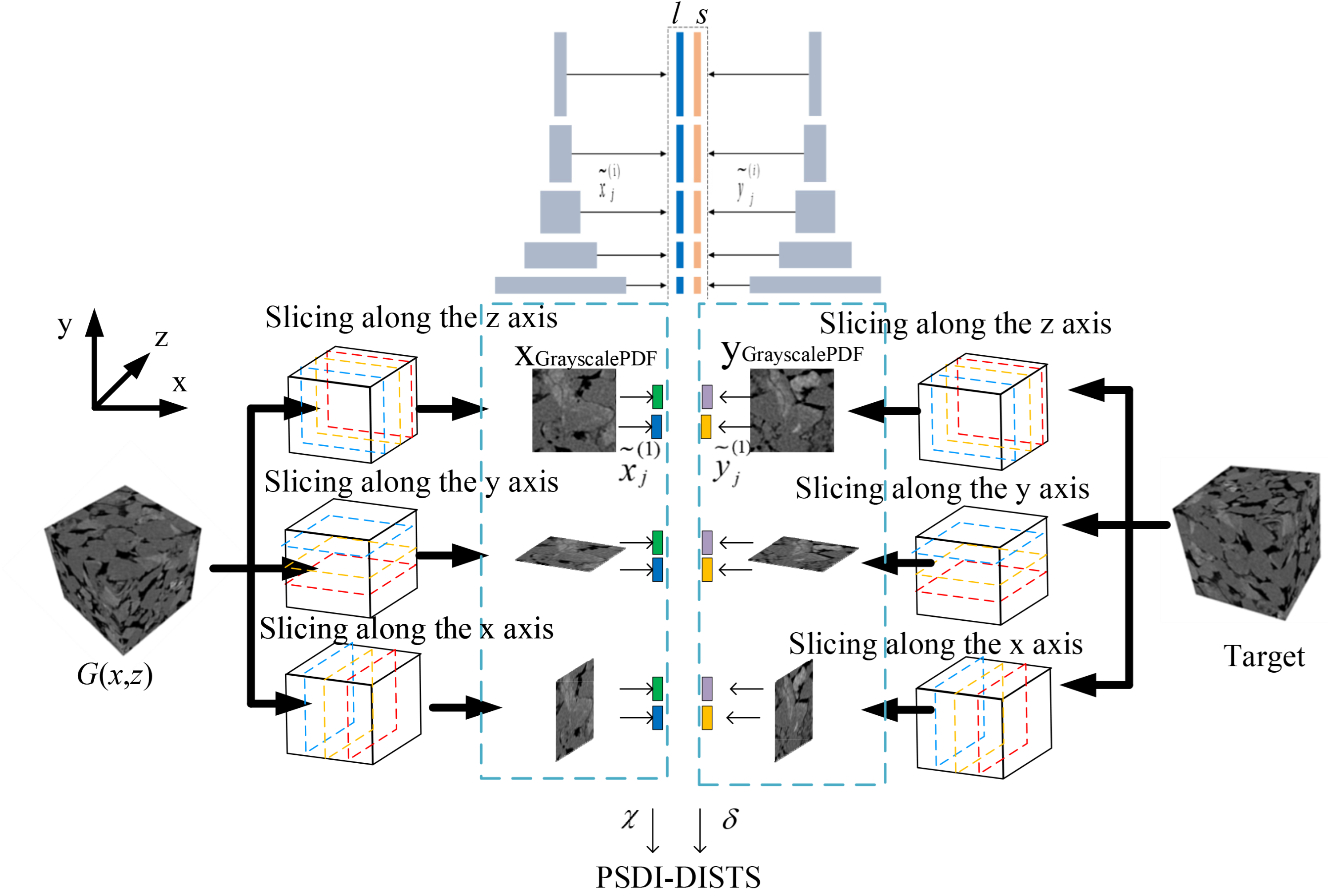 DISTS unifies structure and texture similarities, is robust to mild geometric distortions, and performs well in texture-relevant tasks. However, not only does the gray-scale core image reconstruction task require that the generated image has texture similarity with the target image but the subsequent generated image also needs to be used to simulate physical properties such as seepage characteristics. Therefore, the addition of a PSD is crucial. Simultaneously, the 3D gray-scale core structure must be reconstructed; therefore, it is necessary to perform a similarity evaluation in the x, y, and z directions. Accordingly, this study proposes and constructs a PSDI-DISTS metric. Two-dimensional slices are extracted from I