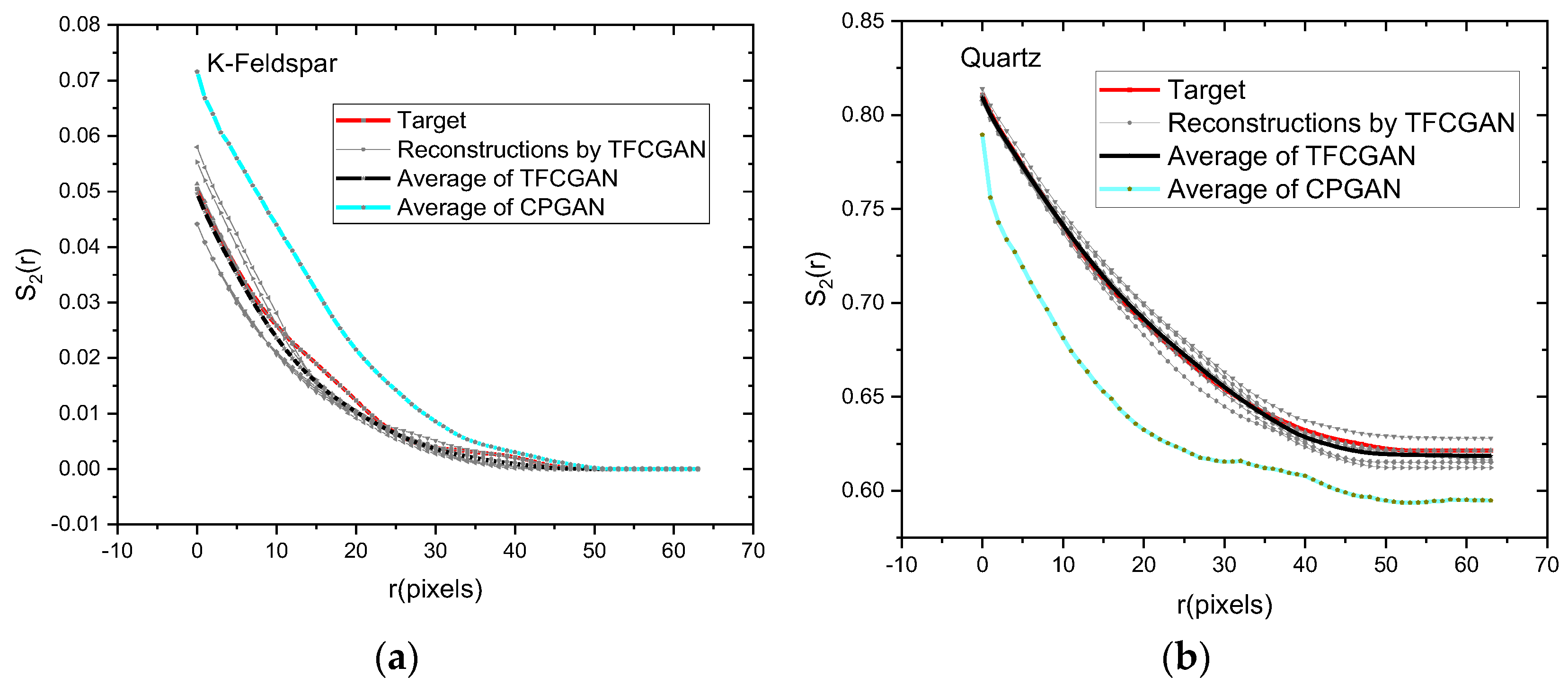 37], as a full-reference image quality assessment model, has a good correlation with the human perception of image quality. In addition, it can evaluate texture similarity (e.g., to evaluate images generated by GANs) and effectively handle geometric transformations (the evaluation is not strictly point-by-point-aligned image pairs; therefore, they can handle the “visual texture,” which is loosely defined as spatially uniform areas with repeating elements. DISTS has significant advantages in preserving texture properties. If it could be combined with physical statistical descriptors, it could generate structures that simultaneously maintain good texture properties and physical statistical properties for core reconstruction.