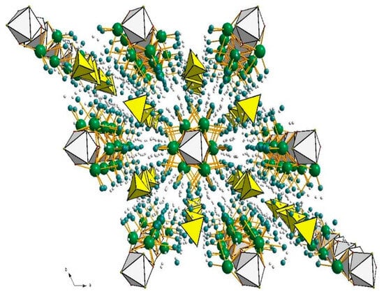 - At an industrial scale, the use of ettringite (Ca6Al2(SO4)3(OH)12·26H2O) has also proven effective [46]. Ettringite, a clay and a key hydration product of Portland cement, can be synthesized from hydrated aluminum sulfate (Al2(SO4)3·18H2O) and calcium hydroxide [47]. Its structure comprises columns of (Ca6[Al2(OH)12·24H2O]6+) aligned along the c-axis, with sulfate (SO42−) and water molecules occupying the intercolumnar channels (Figure 1). The framework is stabilized by hydrogen bonding [48], and its open architecture allows for water mobility and ion exchange [49]. Specifically, ettringite can exchange one sulfate ion for one borate ion, turning into the clay mineral charlesite (Ca6Al2(SO4)2(B(OH)4)(OH,O)12·26H2O), which belongs to the same group [50]. Amorphous meta-ettringite, obtained from ettringite through thermal dehydration at temperature higher than 65 °C, has been claimed as more effective than ettringite as such [51]. Importance of meta-ettringite has also been confirmed in a study dealing with Portland cement waste as a low-cost boron adsorbent [52]. Charlesite cannot be considered an exploitable boron raw material because its theoretical boron content of 0.7% wt. is far less than the 15.0% wt. found in state-of-the-art minerals. According to that, other valorization routes alternative to landfilling have to be considered [53].