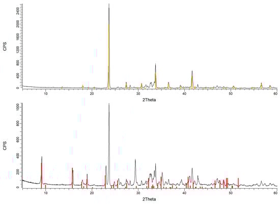 XRD patterns of clinker (top) and boron-rich solids from Test E (bottom). For the sake of clarity, only the main crystal phases are evidenced: ye’elimite in clinker (orange bars) and ettringite in boron-rich solids from Test E (red bars). The detailed crystalline phase composition is reported in Table 4.