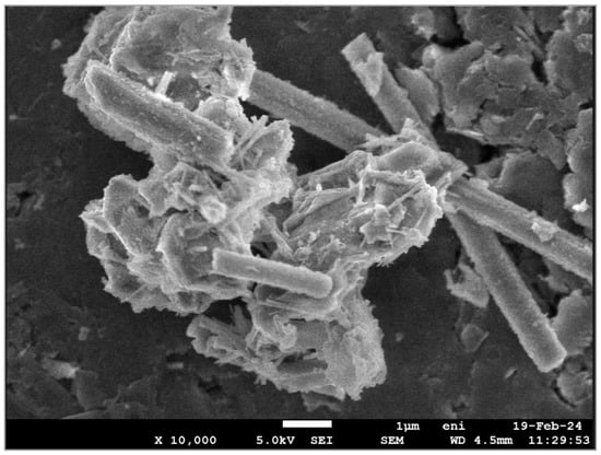 High-resolution micrographs were obtained using scanning electron microscopy (SEM) with a Jeol JSM 7600F™ instrument (Jeol Italia, Basiglio, Italy) operated at an accelerating voltage of 5 kV, utilizing the secondary electron signal for imaging. Samples were examined in their native state, without any metallization treatment. Prior to imaging, the powdered materials were ground, sonicated in Carlo Erba Reagents RPETM 2-propanol (C3H7-OH) (Carlo Erba Reagents, Cornaredo, Italy), and deposited as suspensions onto conductive carbon tape. Imaging was performed after complete solvent evaporation, covering the entire sample area to ensure statistically representative morphological characterization.