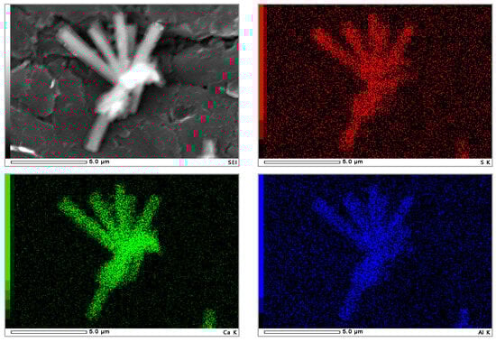 The high-resolution micrograph of boron-rich solids from Test E, shown in Figure 3, shows the typical needle-like ettringite morphology with micrometer crystal lengths, which is confirmed by the multielement X-ray maps of calcium, sulfur, and aluminum in Figure 4.