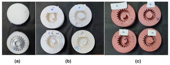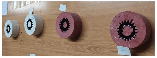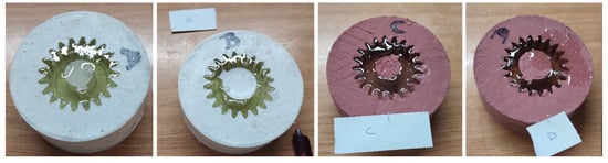 The process of producing reproductions with RECAPOLI 2196 (Resinas Castro S.L., Pontevedra, Spain) resin (Figure 4) is characterized by its simplicity, as it does not necessitate the application of heat to the molds or the establishment of a vacuum for a specific component. The required quantities of resin were meticulously measured, and a 2% catalyst was incorporated, employing the standard methyl ethyl ketone peroxide catalyst X-8 (Resinas Castro S.L., Pontevedra, Spain). Subsequent to the homogenization of the mixture, it was poured into the designated molds. Subsequent to a 30-min waiting period, the gears were removed from the molds.