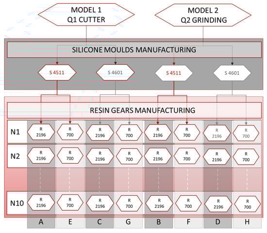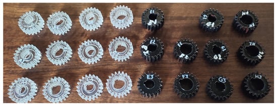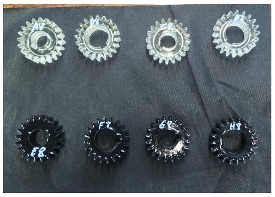 A total of eight molds were manufactured, and ten resin gears were produced per mold, resulting in a total of 80 resin gears (40 per resin type). After a visual inspection, no deterioration was detected in the silicone molds, nor were any anomalies observed on the surface of the gears. This led to all pieces being considered valid for their study in the DOE.