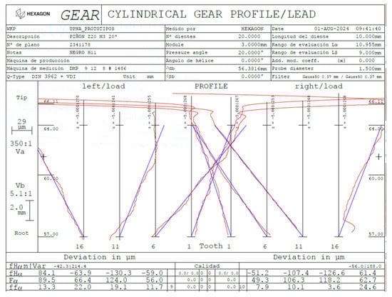Gears are essential components in the transmission of mechanical power. The precision of their geometry is a critical factor in determining the efficiency, reliability, and operational durability of the system. Geometric deviations in gears, such as irregularities in the shape of the profile, errors in the helix slope and eccentricity, can compromise system performance. These deviations can generate transmission inefficiencies, increased vibrations, and premature failures in the mechanical assembly. For each operating condition of the gears (speed, reduction ratio, friction coefficient), a certain quality of the gear teeth is required, usually specified in terms of Deviation from Profile Shape (ff) and Propeller Shape Deviation (ff). Conventional inspection techniques, which have been superseded by advances in three-dimensional technology, were historically employed for gear inspection. The development of advanced verification methods has been driven by two factors: the increasing complexity of designs and the need to minimize failures in critical applications [25]. The integration of TCM and Quindos has enhanced the precision of dimensional verification, thereby reducing margins of error and optimizing manufacturing processes [26].