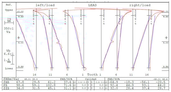 A reference measurement was conducted for both gear models. Four different teeth were checked on both the right and left flanks. The main values of these measurements are presented in Table 5.