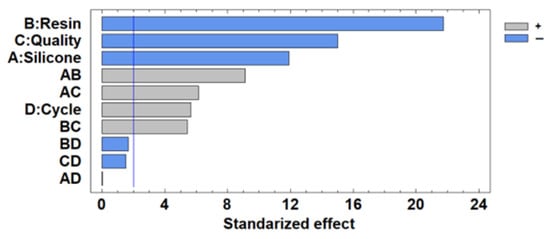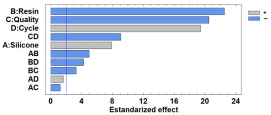 As shown in Figure 12, the Pareto diagram obtained from the analysis reveals that the type of resin, the casting cycle, the initial quality of the model gear, and the silicone are significant variables in the study.